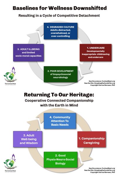 Breaking the Cycle contrasts the two basic ways societies can function: the optimal approach, which most human societies through time have followed, is the Cycle of Cooperative Companionship where children’s basic needs are met; they grow into well-functioning, cooperative community members (from neurobiology and on up); and as healthy adults, they maintain the cooperative system. Currently in the USA the opposite pattern is in place: children’s basic needs are not met, illbeing and dysregulation ensue, creating adults who are detached and distracted and keep this Cycle of Competitive Detachment going. The United Nations ranks the USA as 41st out of 41 developed countries for child and adult wellness.